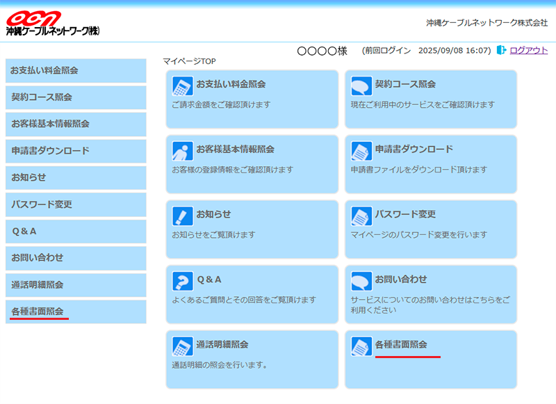1.マイページにログイン後、「各種書面照会」をクリックします。