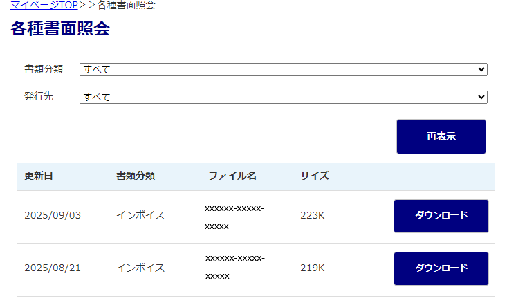 ※すでに適格請求書(インボイス)にお申込み頂いているお客様は、マイページにて書面が発行できます。下記手順をご確認ください。