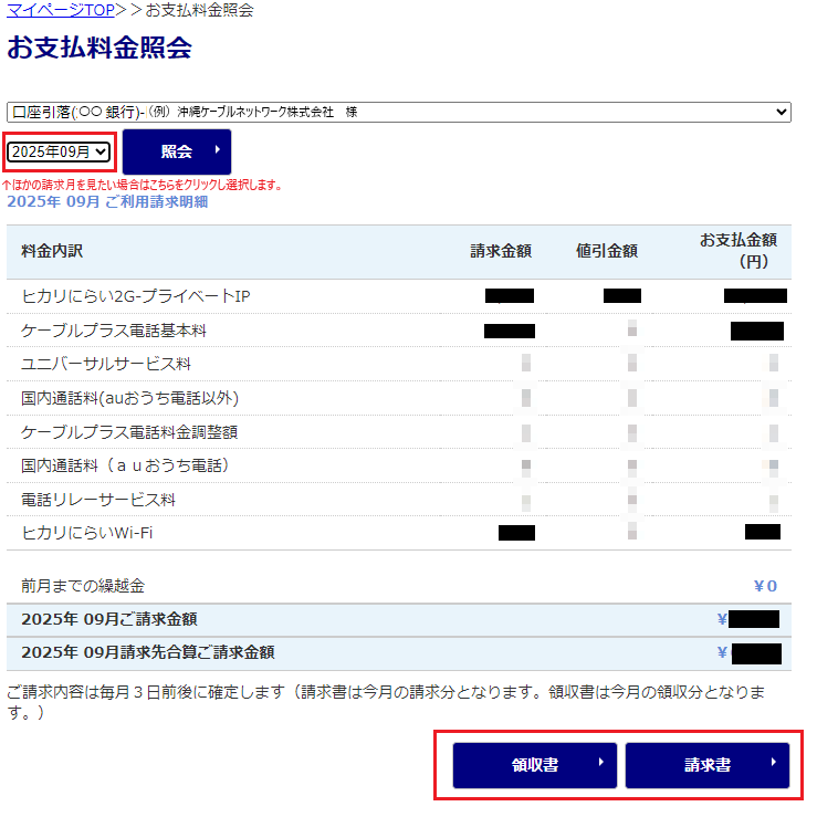 2.ご請求金額が確認できます。前月のご請求金額を確認したい場合は、プルダウンメニューから選択します。領収書や請求書を発行することもできます。